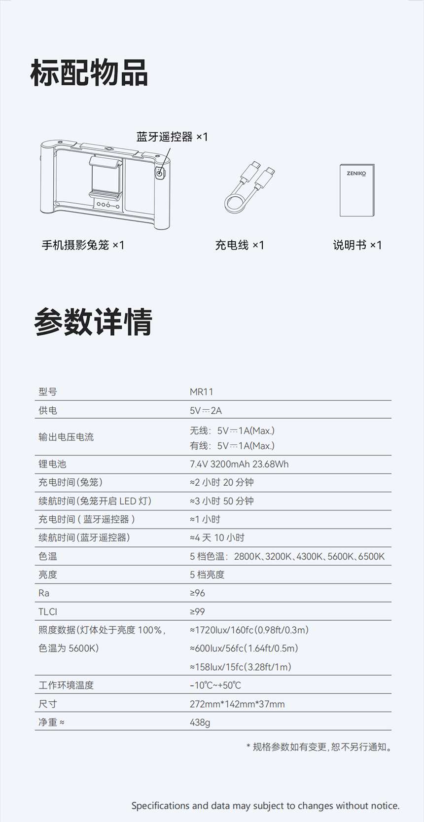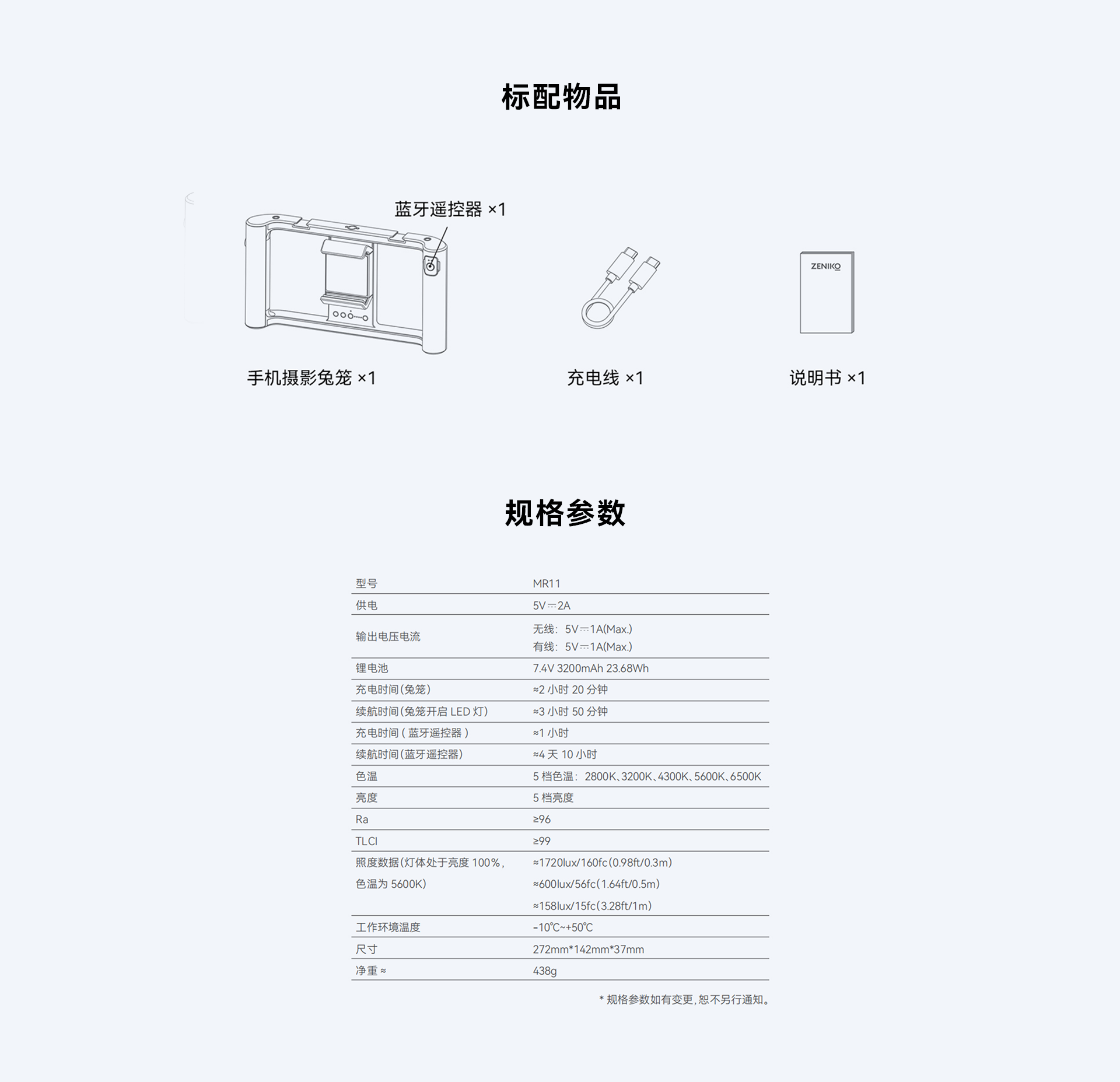 MR11配备高色彩还原度Ra≥96和TLCl≥99的优质LED灯,提供2800K到6500K的5级色温调节,以及5级亮度调节,是摄影师和摄像师的全能工具